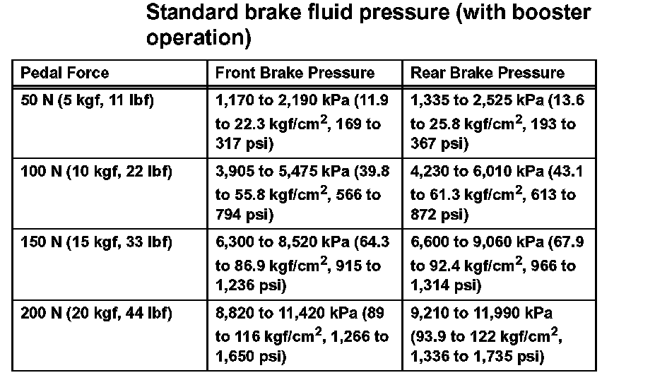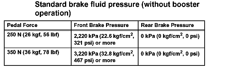 (2) Depress the brake pedal (see table below) and check the fluid pressure.