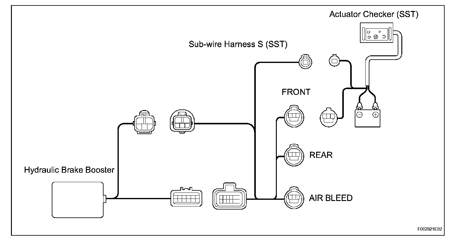 (c) Connect the actuator checker (SST) to the hydraulic brake master cylinder side wire harness via the sub-wire harness S (SST), as shown in the illustration below.