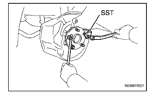 (b) Using SST and a brass bar or equivalent to hold the axle shaft, remove the hub bolt.