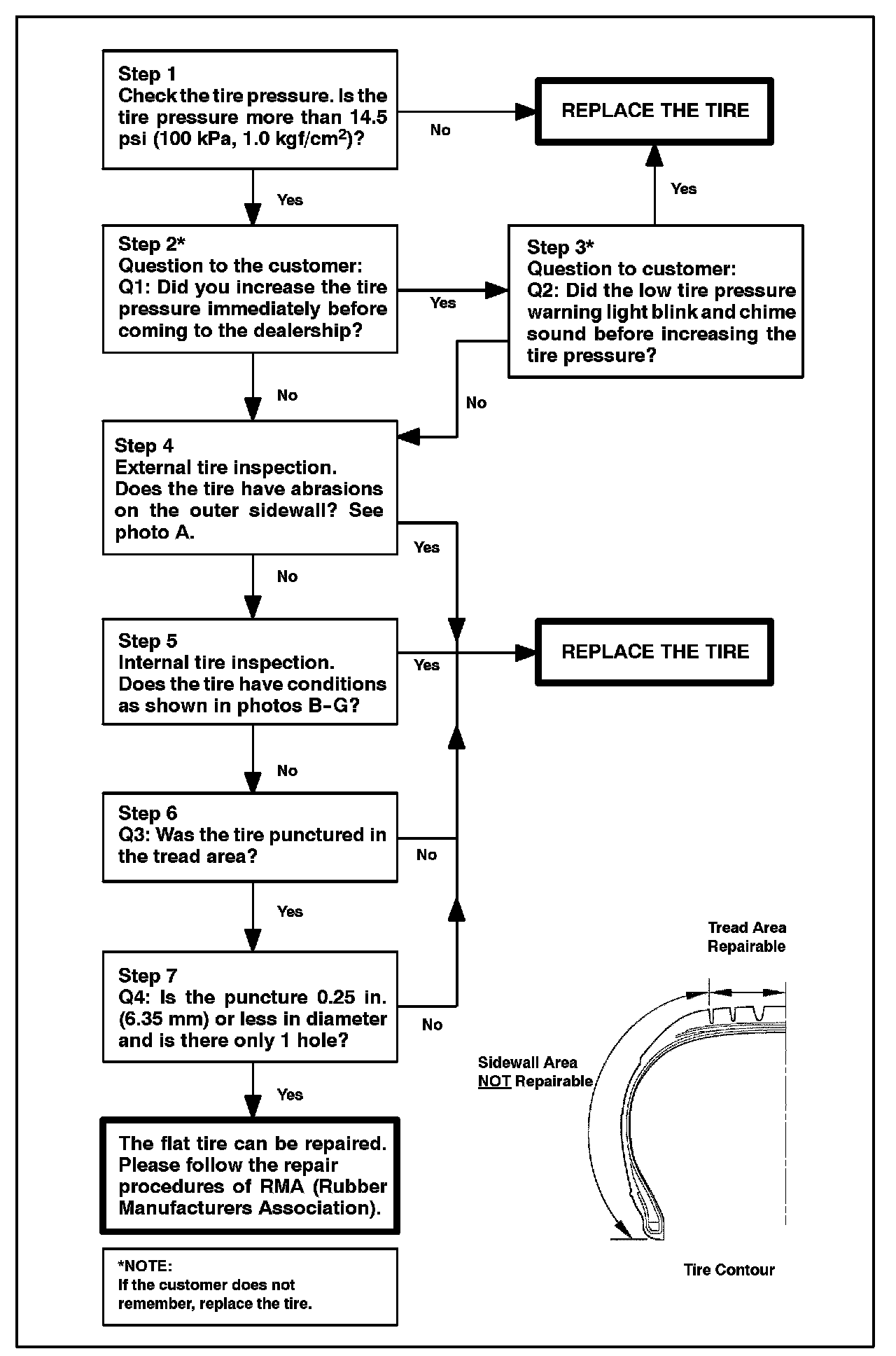 However, there are some cases where it is possible to repair the run flat tires by the same repair method as normal tires. Please use the flowchart in this bulletin to determine whether or not it is possible to repair the tires.