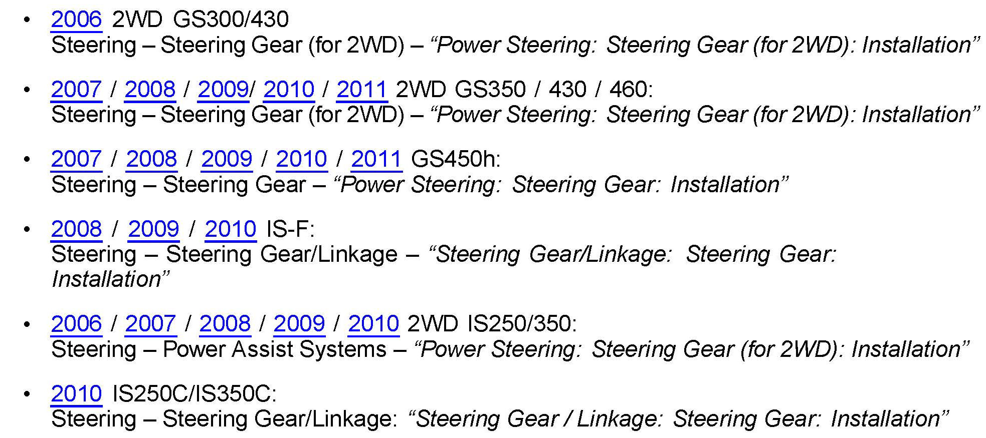 Some Lexus vehicles may exhibit an intermittent non-binding notchy steering feel and/or the steering wheel will not smoothly self-center when driving at highway speeds. This condition may occur when changing lanes or when coming out of long sweeping turns at highway speeds. Please use the following repair procedure to address this condition.