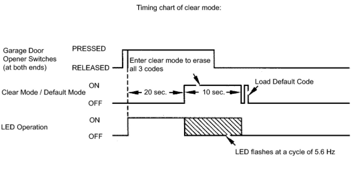 (1) Press and hold the left and right switches of the garage door opener for 20 seconds. The LED will begin flashing at 5.6 Hz. Releasing the switches will end clear mode.