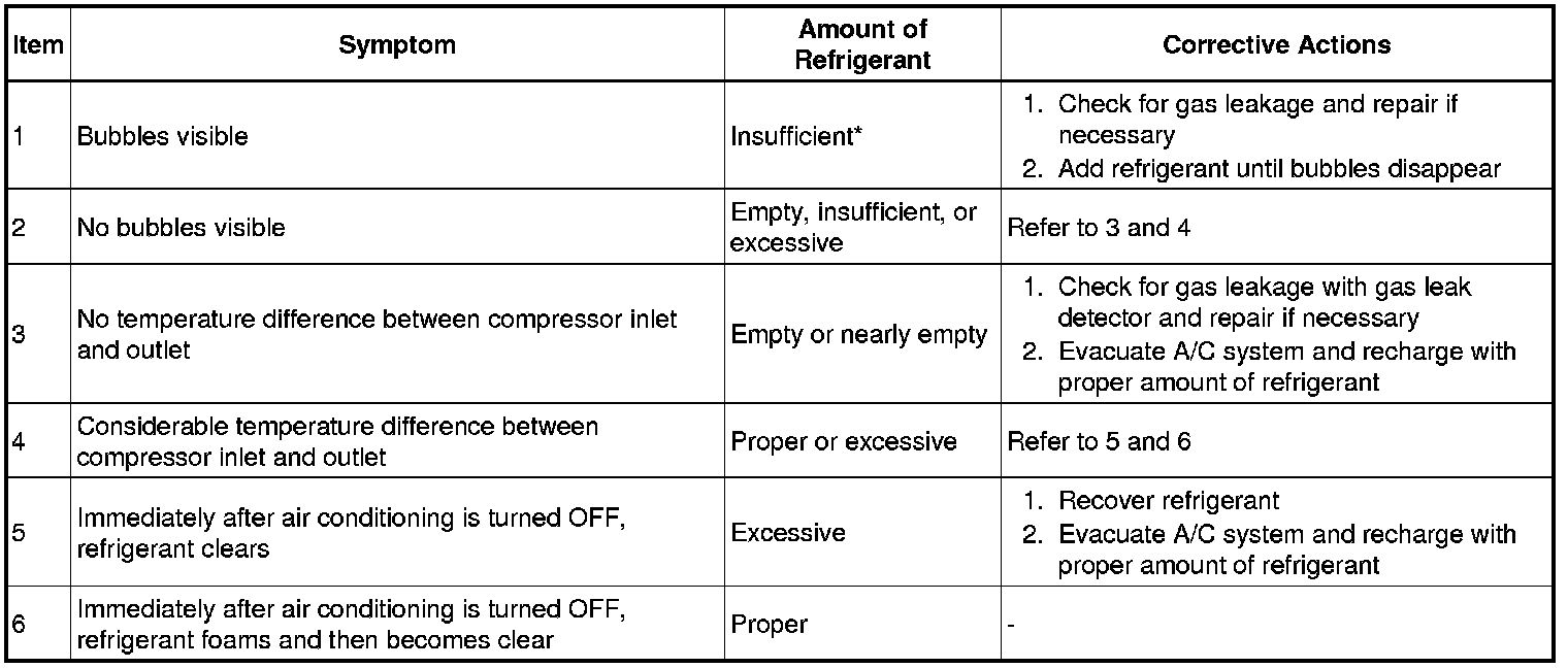 *: Bubbles in the sight glass with the vehicle interior temperature above 35°C (95°F) can be considered normal if cooling is sufficient.