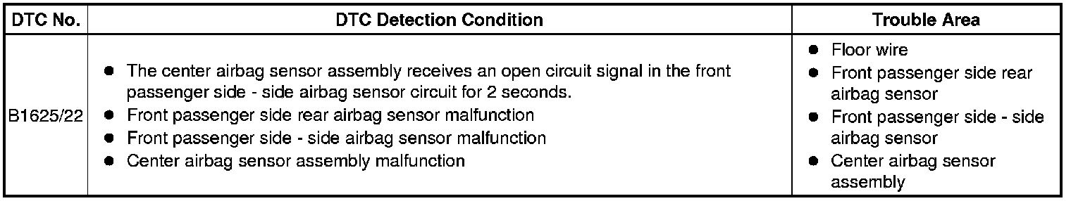 DTC B1625/22 is recorded when a malfunction is detected in the front passenger side - side airbag sensor circuit.