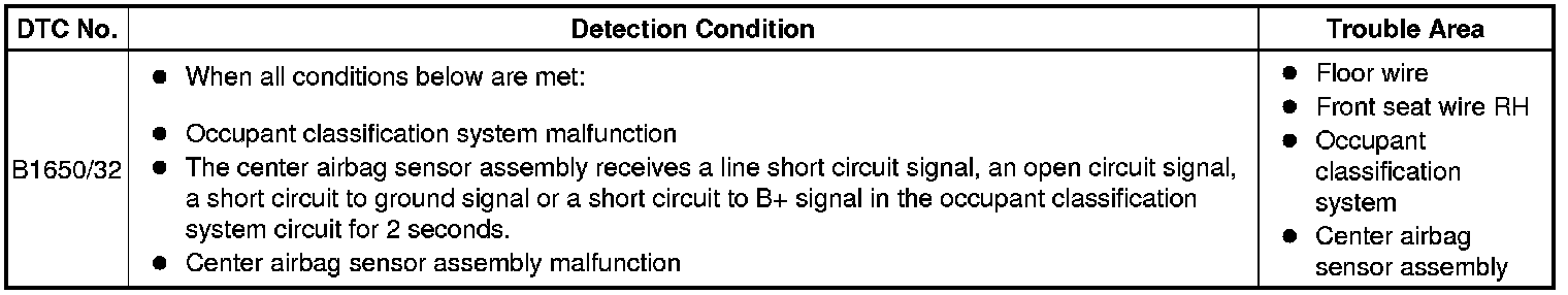 DTC B1650/32 is recorded when a malfunction is detected in the occupant classification system circuit.