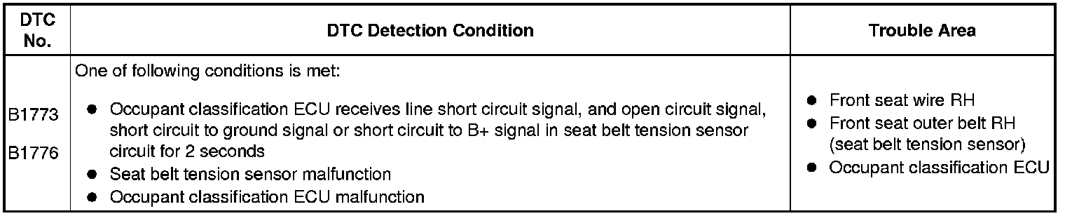 DTC B1773 and B1776 are recorded when a malfunction is detected in the seat belt tension sensor circuit.