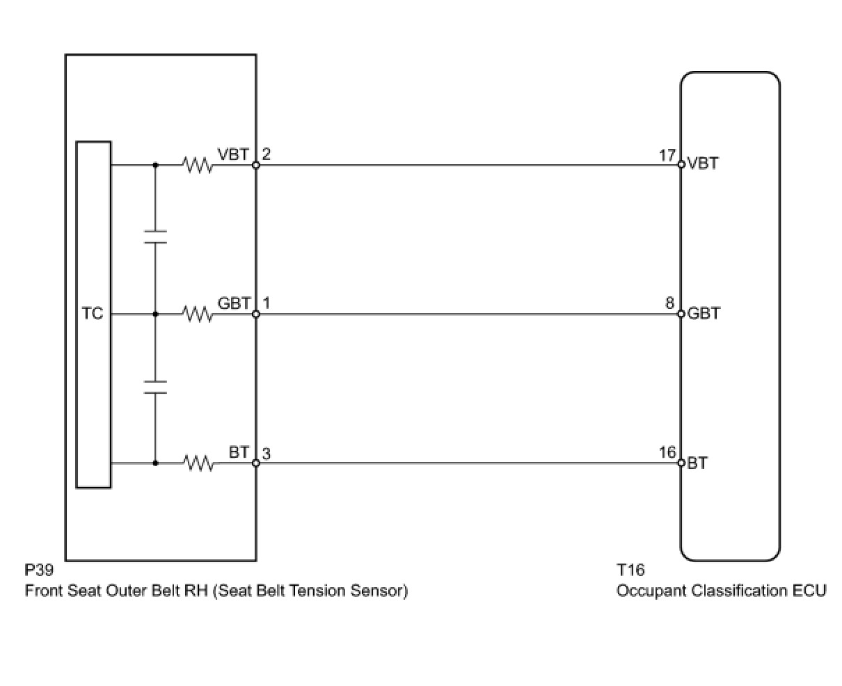 The seat belt tension sensor circuit consists of the occupant classification ECU and the seat belt tension sensor.