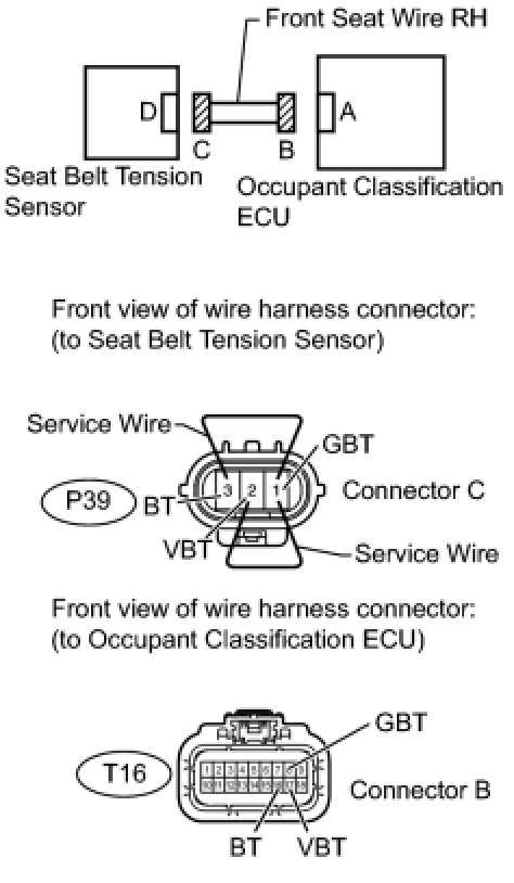 (b) Check that the connectors (on the occupant classification ECU side and seat belt tension sensor side) are not damaged.