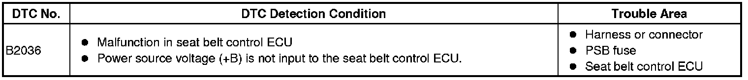 If the seat belt control ECU judges that there is a malfunction in its internal circuit as a result of self-diagnosis, or if the power source voltage (+B) is not input to the seat belt control ECU, this DTC will be stored.