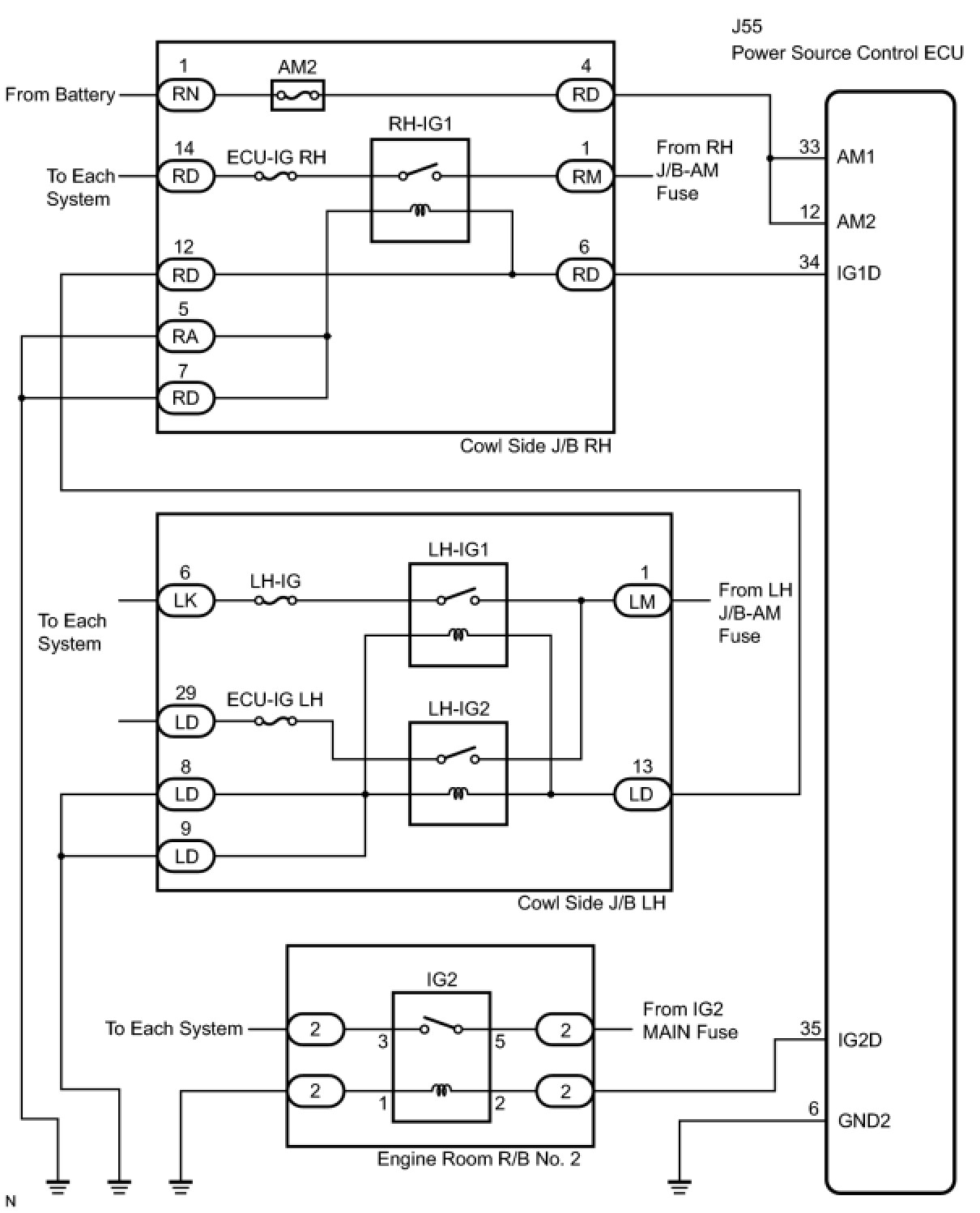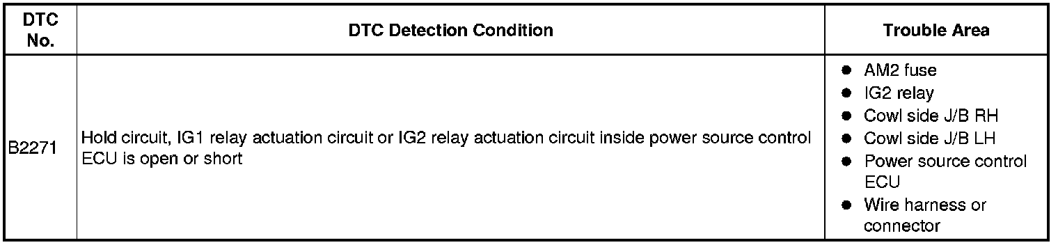 This DTC is output when a problem such as an open in the AM2 fuse, an open or short in the wire harness between the fuse and power source control ECU, a short in the IG output circuit inside the power source control ECU, a short between the power source control ECU and relay, and a short in the relay is detected.