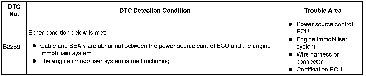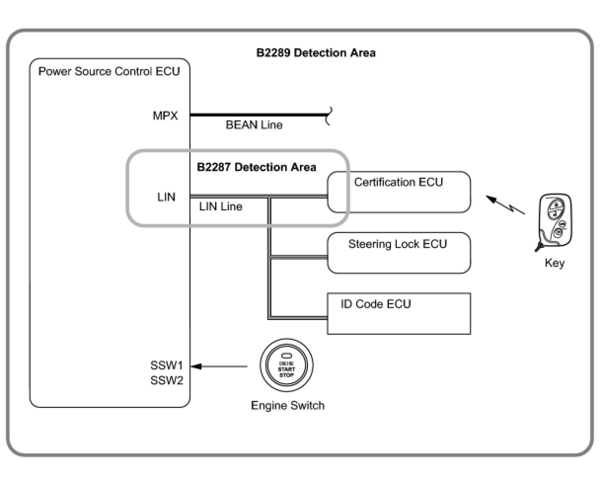 This DTC is output when there is a LIN communication problem between the power source control ECU and certification ECU or when there is a problem in the engine immobilizer system.