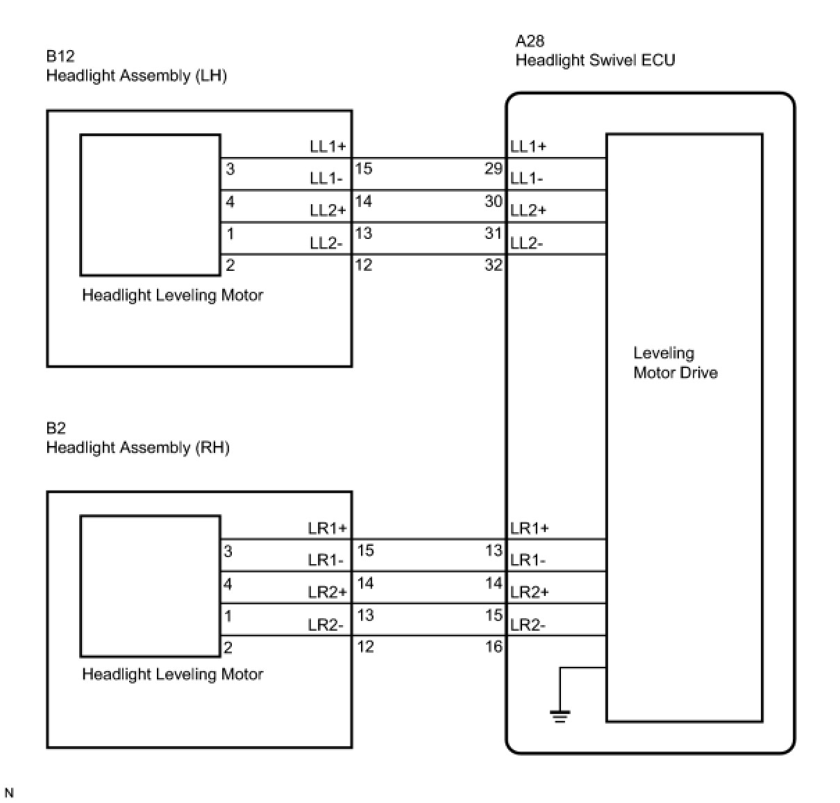 The leveling actuator (headlight leveling motor) receives a signal from the AFS ECU to operate. The AFS ECU receives signals regarding the operating conditions of the leveling actuator (headlight leveling motor).