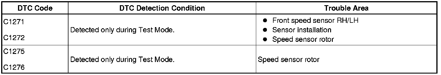 DTCs C1271 to C1276 will be cleared when the speed sensor sends a vehicle speed signal or when Test Mode ends. DTCs from C1271 to C1276 are output only in Test Mode.