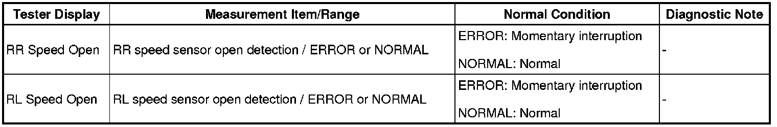 BRAKE CONTROL: VEHICLE STABILITY CONTROL SYSTEM: C1273: Low Output Signal of Rear Speed Sensor RH (Test Mode DTC)