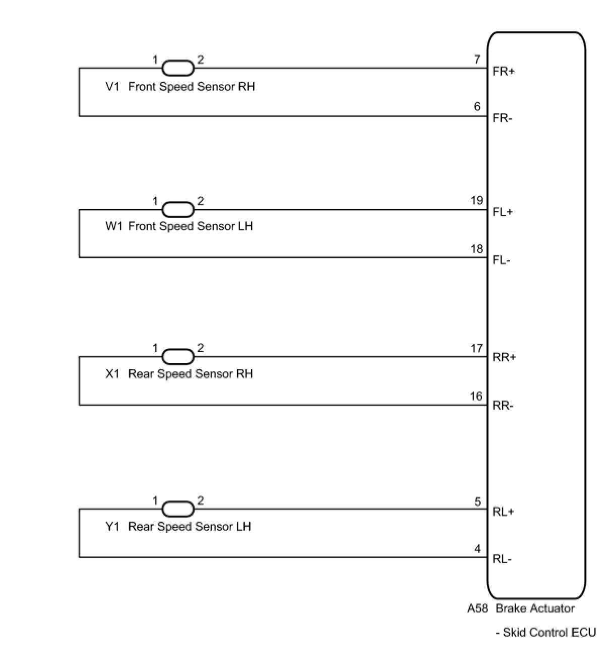 The skid control ECU measures the speed of each wheel by receiving signals from the speed sensor.
