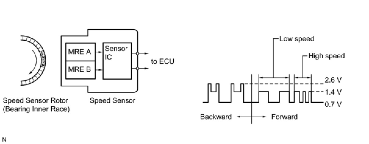 To detect the rotation direction, the output waves are used to determine the relationship of the pulses that are generated by the 2 MREs. Upon receiving this signal, the sensor IC outputs a forward or backward waveform to the ECU.