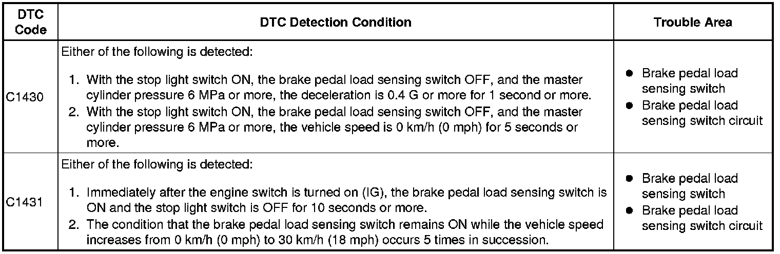 DTC C1431 - Brake Pedal Load Sensing Switch ON Stuck Malfunction