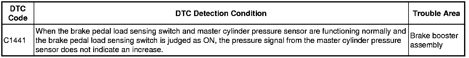 If the brake booster is damaged and does not provide braking support when depressing the brake pedal, the skid control ECU determines that the brake booster has a problem and stores DTC C1441.