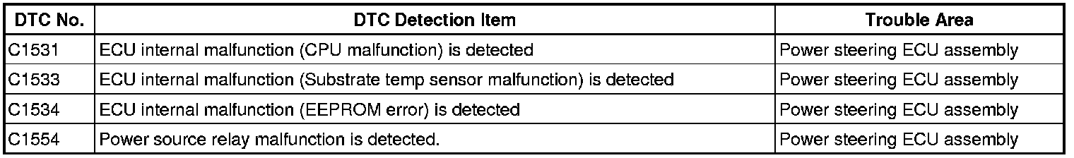 If the power steering ECU assembly detects these DTCs, it will shut off the motor current sensor, power source relay, motor relay circuit (built into the power steering ECU assembly) and stop power assistance. However , power assistance will continue if DTC C1533 or C1534 is output.