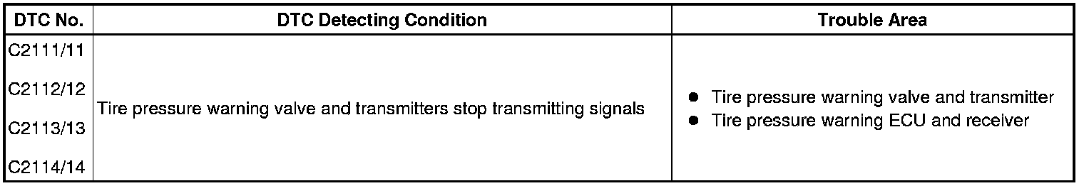 The tire pressure warning valve and transmitters that are installed in the tire and wheel assemblies measure the air pressure of the tires. The measured values are transmitted to the tire pressure warning antenna on the body as radio waves and then sent to the tire pressure warning ECU and receiver. The ECU and receiver compares the measured air pressure values with the air pressure threshold. When the measured air pressure value is less than this threshold, the warning light in the combination meter comes on. The tire pressure warning ECU and receiver stores a DTC when the tire pressure warning valve and transmitter stops transmitting signals. At this time, forcibly transmit the signals by releasing the tire pressure rapidly. The stored DTC is cleared when the signal transmission is resumed.