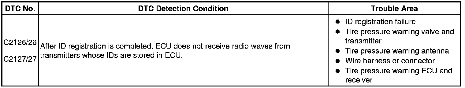 When the tire pressure waning ECU and receiver successfully receives radio waves from all the transmitters whose IDs are stored in the ECU, DTC C2126/26 or C2127/27 is deleted and the tire pressure warning light goes off.
