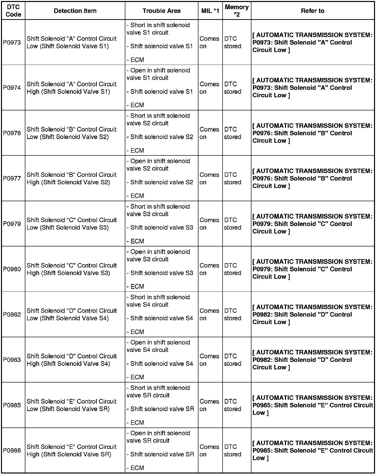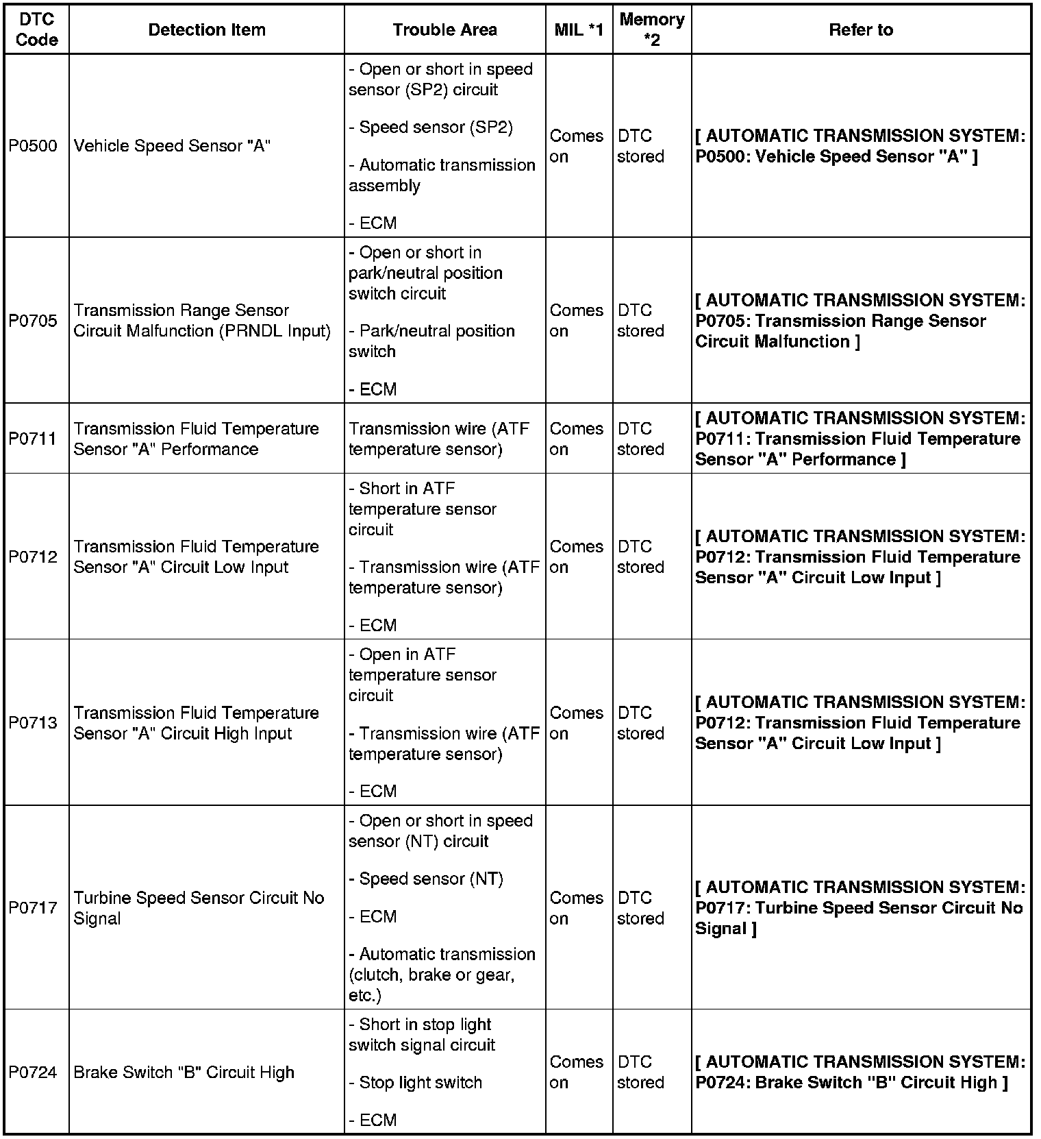- *2: "DTC stored" mark means ECM memorizes the malfunction code if the ECM detects the DTC detection condition.