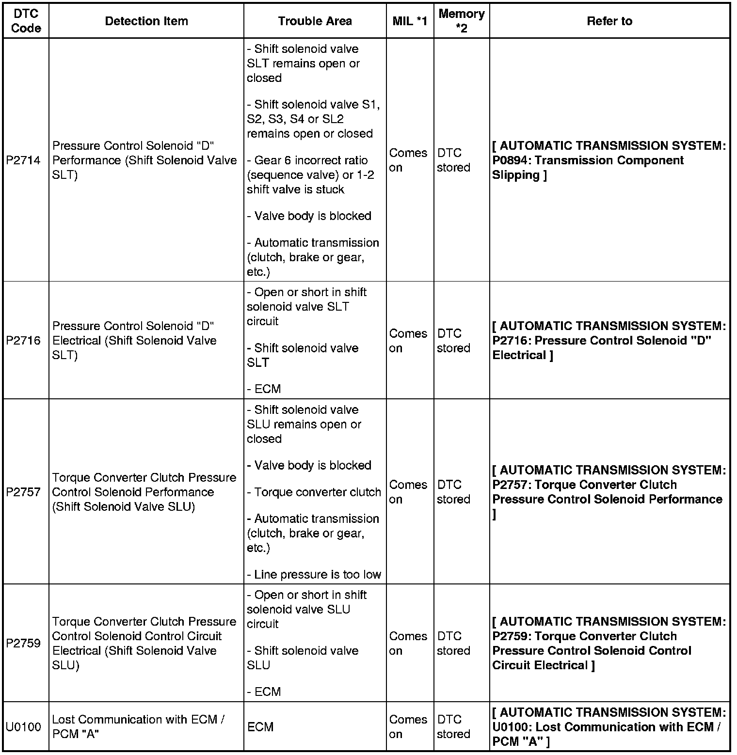 A760H AUTOMATIC TRANSMISSION: AUTOMATIC TRANSMISSION SYSTEM: DIAGNOSTIC TROUBLE CODE CHART