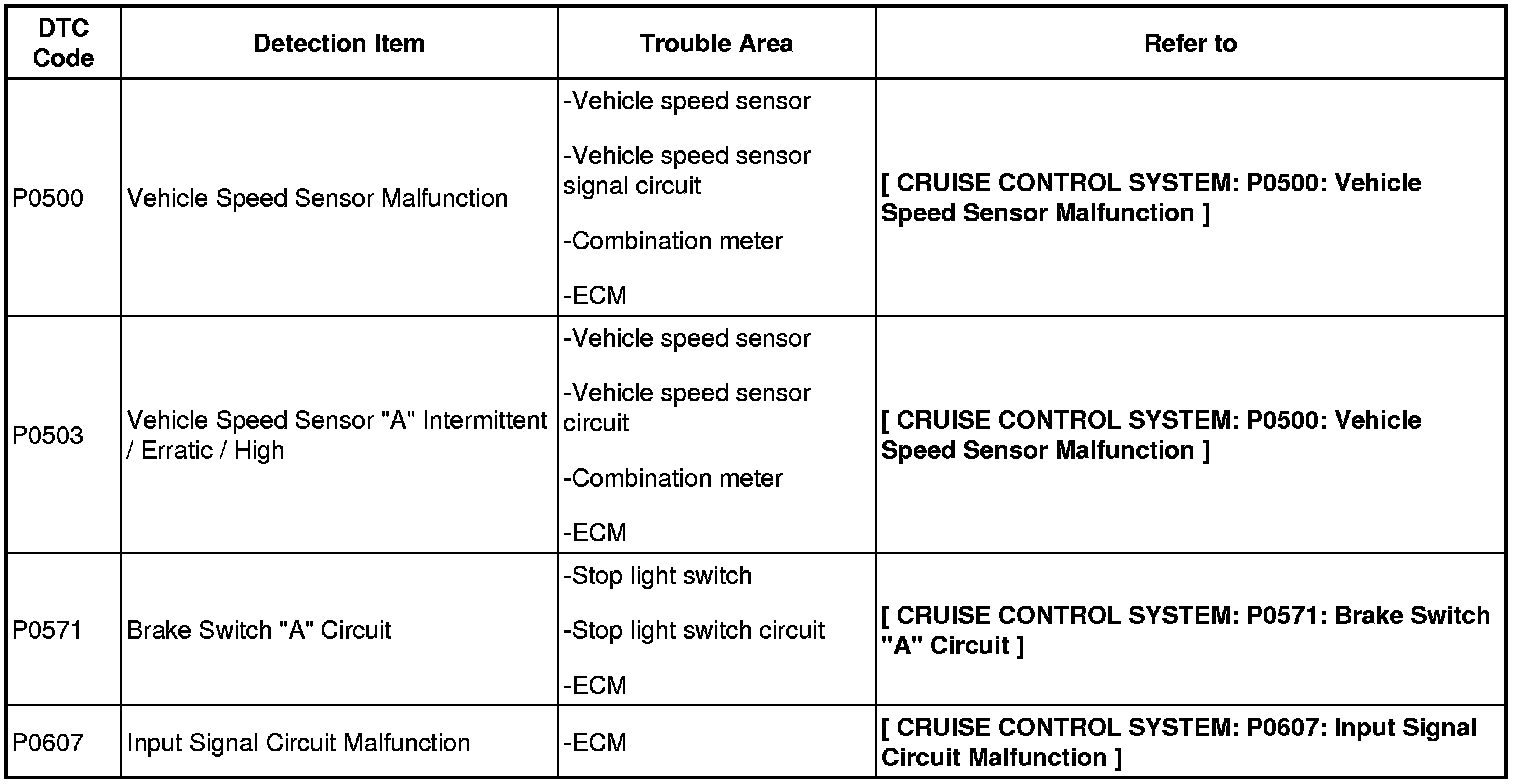 CRUISE CONTROL: CRUISE CONTROL SYSTEM: DIAGNOSTIC TROUBLE CODE CHART