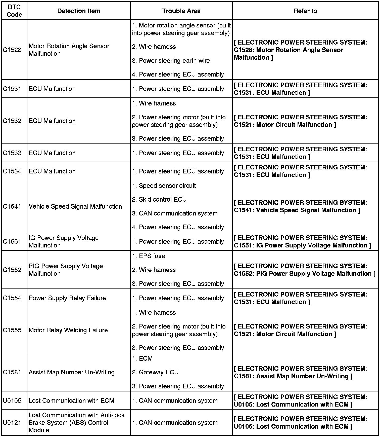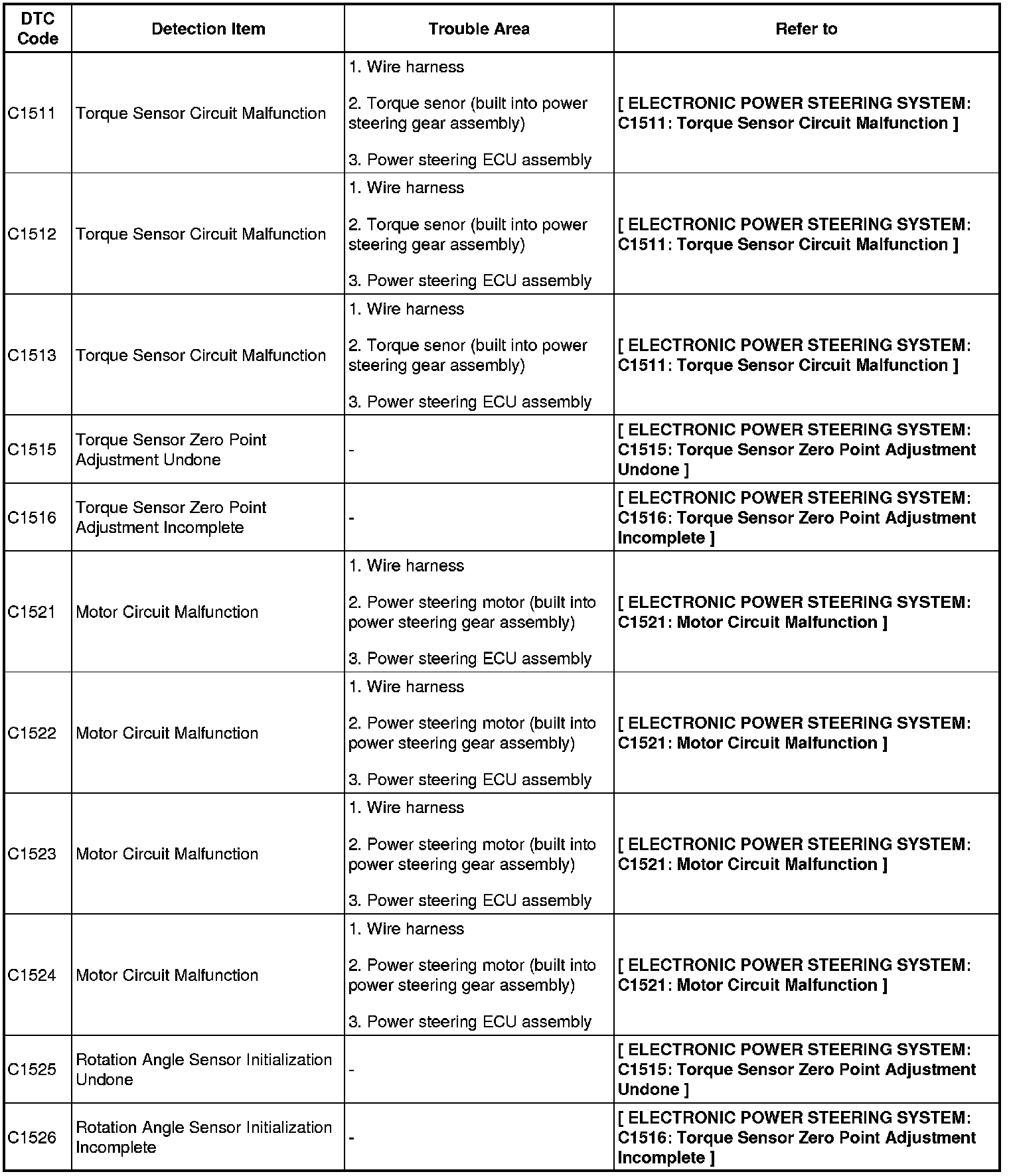 ELECTRONIC POWER STEERING SYSTEM DIAGNOSTIC TROUBLE CODE CHART