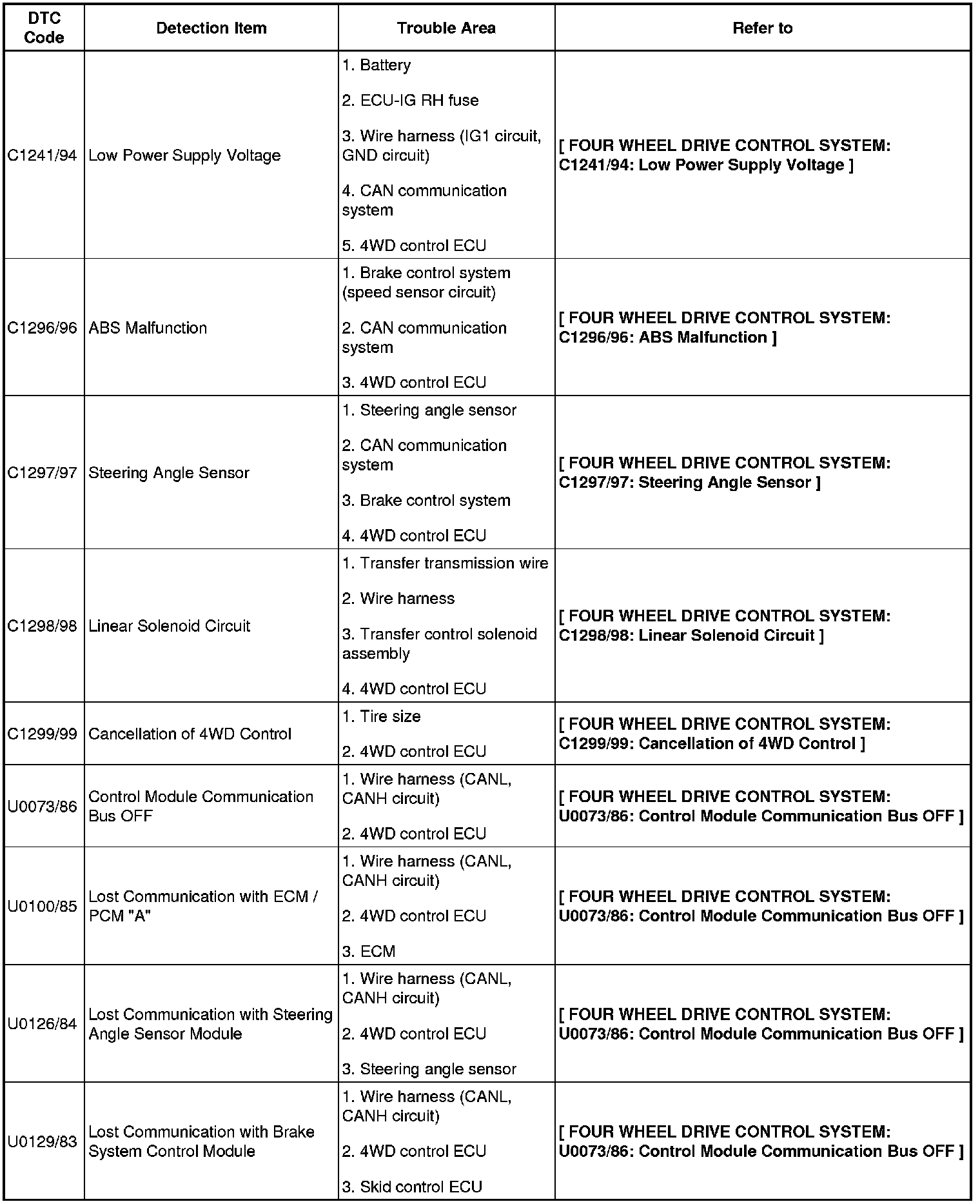 DTC C1241/94-C1299/99/U0073/86-U0129/83: