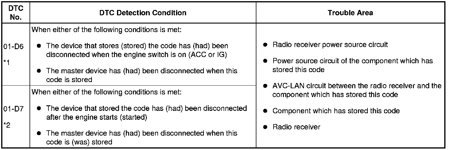 (2) Check for an open or short in the AVC-LAN circuit between the radio receiver and the component which has stored this code.