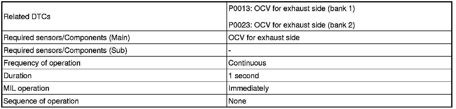 The ECM optimizes the valve timing using the VVT system to control the exhaust camshaft. The VVT system includes the ECM, the OCV and the VVT controller. The ECM sends a target duty-cycle control signal to the OCV. This control signal regulates the oil pressure supplied to the VVT controller. The VVT controller can advance or retard the exhaust camshaft.