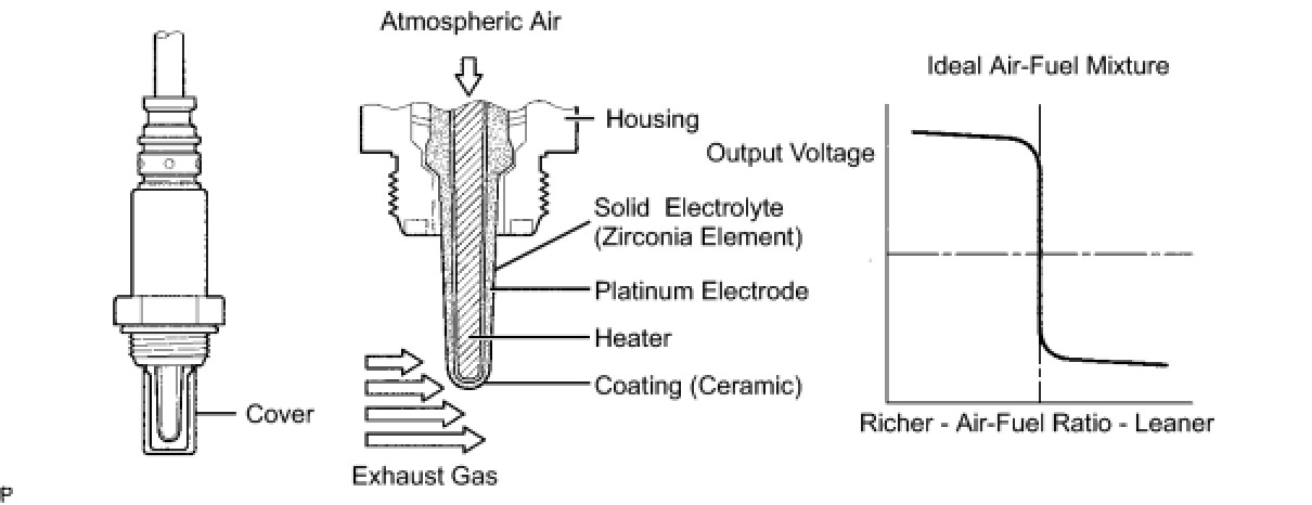 The sensing position of the Heated Oxygen (HO2) sensor has a zirconia element which is used to detect the oxygen concentration in the exhaust gas. If the zirconia element is at the appropriate temperature, and he difference between the oxygen concentrations surrounding the inside and outside surfaces of the sensor is large, the zirconia element generates voltage signals. In order to increase the oxygen concentration detecting capacity of the zirconia element, the ECM supplements the heat from the exhaust with heat from a heating element inside the sensor.