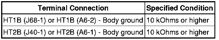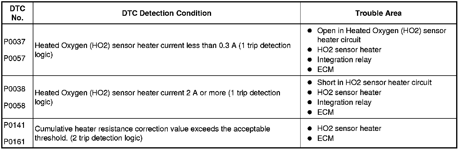 The ECM sets DTC P0038 or P0058 when the current in the HO2 sensor heater is more than 2 A. Conversely, when the heater current is less than 0.3 A, DTC P0037 or P0057 is set.