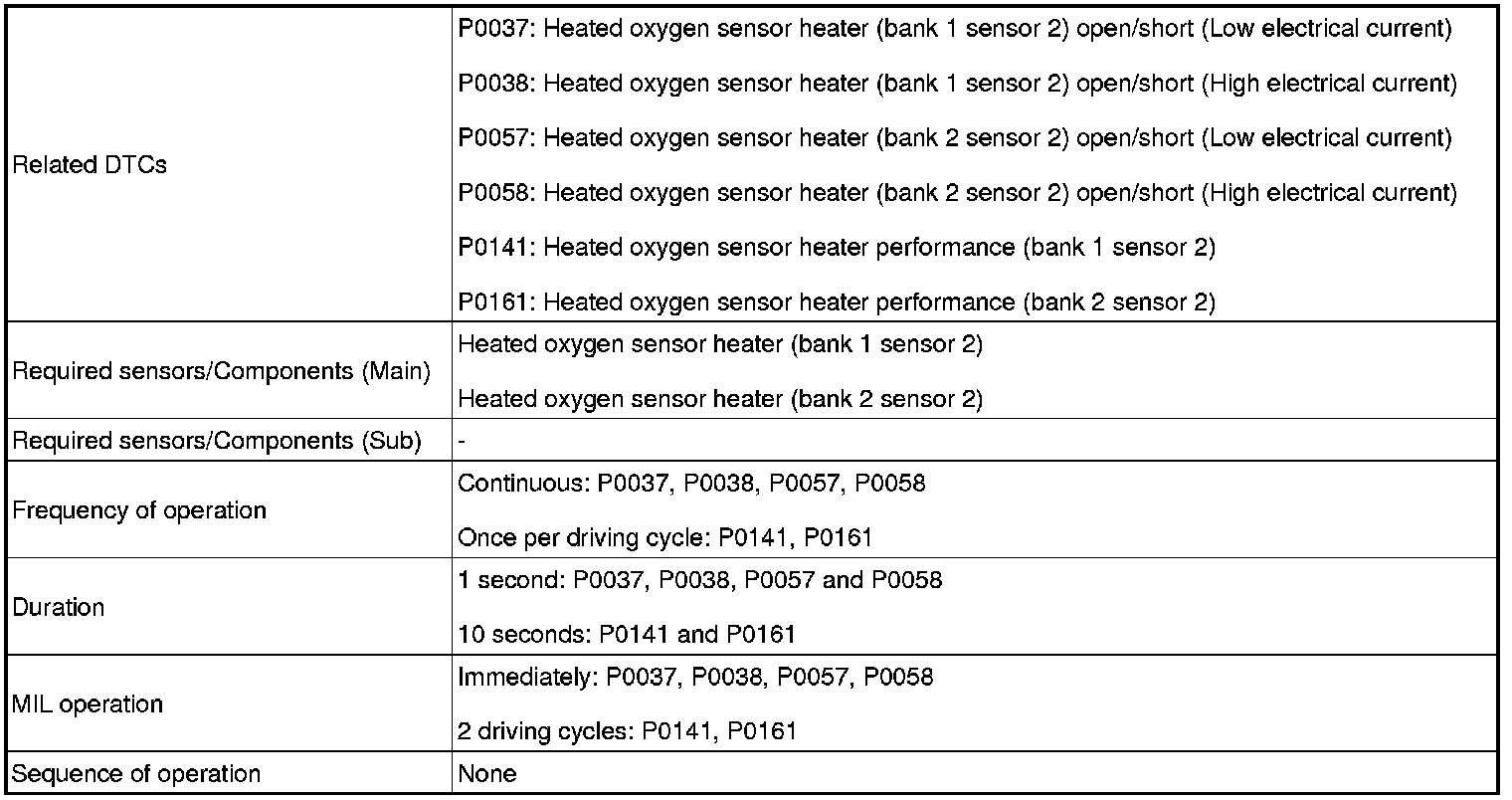 Heated oxygen sensor heater range check (P0037,P0038, P0057 and P0058):