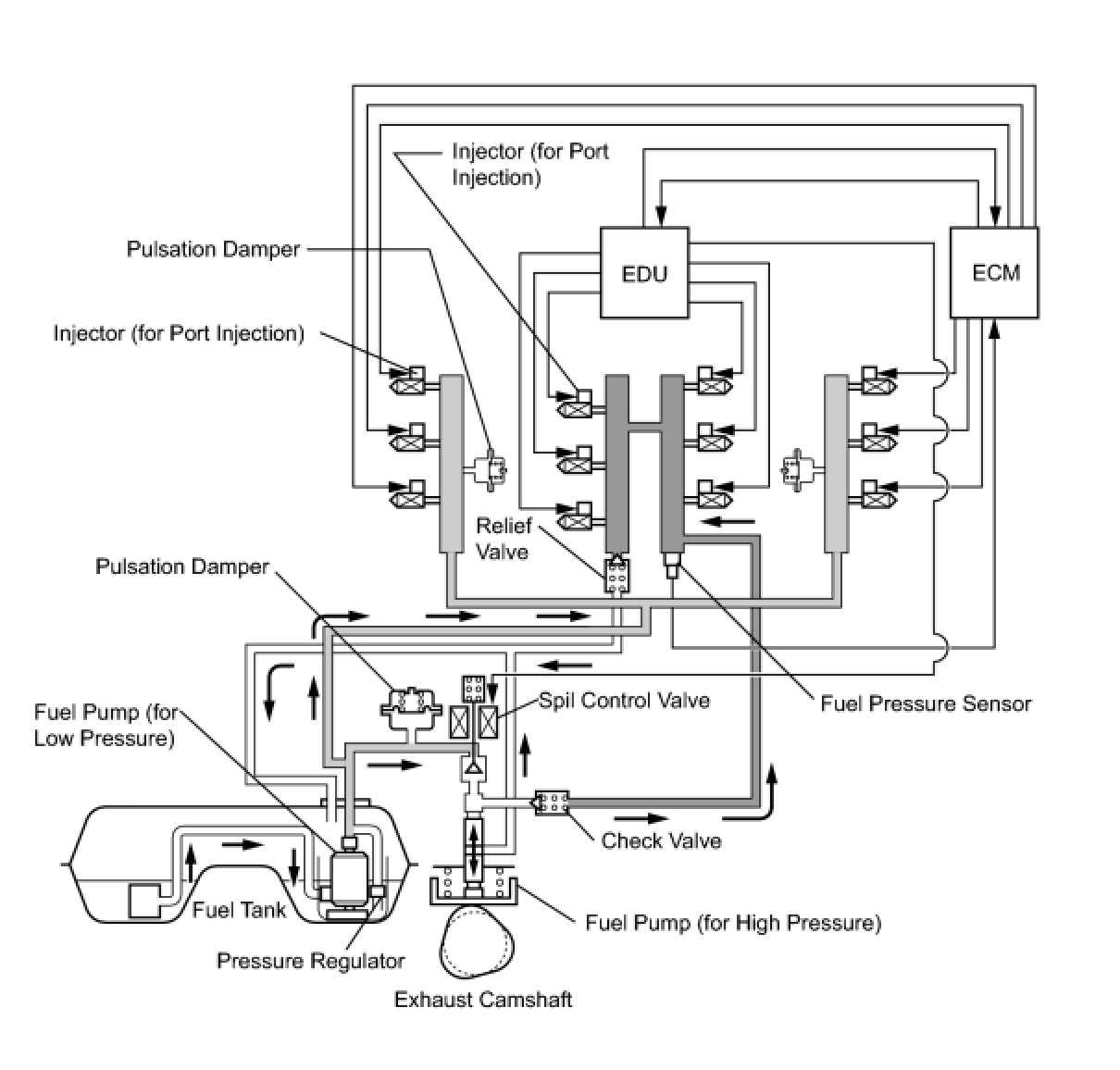 If the internal fuel pressure of the fuel delivery pipe exceeds the standard pressure 15 MPa (153 kgf/cm2, 2175 psi), the fuel relief valve installed on gateway of the fuel delivery pipe discharges the fuel pressure and then returns the fuel back to the fuel tank.