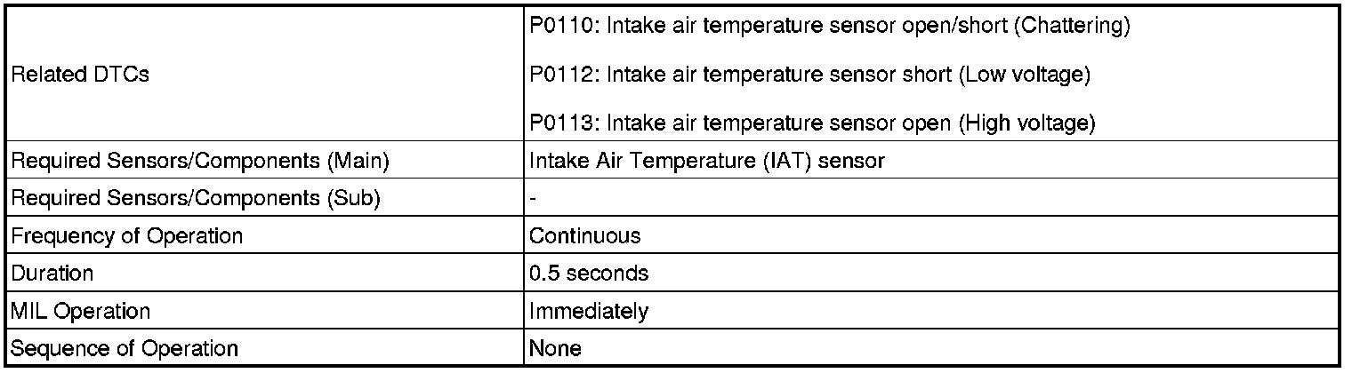 The ECM monitors the sensor voltage and uses this value to calculate the Intake Air Temperature (IAT). When the sensor output voltage deviates from the normal operating range, the ECM interprets this as a malfunction in the IAT sensor and sets a DTC.