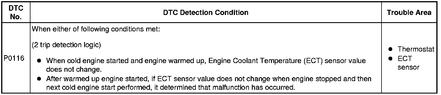 When a cold engine start is performed and then the engine is warmed up, if the ECT sensor value does not change, it is determined that a malfunction has occurred. If this is detected in 2 consecutive driving cycles, the MIL is illuminated and a DTC is set.