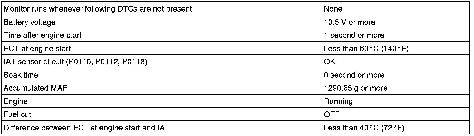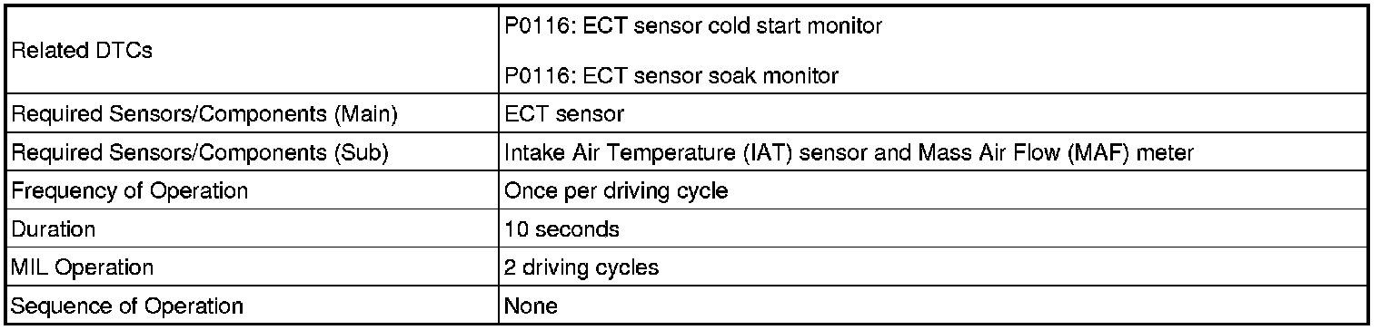 After a warmed up engine is started, if the ECT sensor value does not change when the engine is stopped and then the next cold engine start is performed, it is determined that a malfunction has occurred. If this is detected in 2 consecutive driving cycles, the MIL is illuminated and a DTC is set.