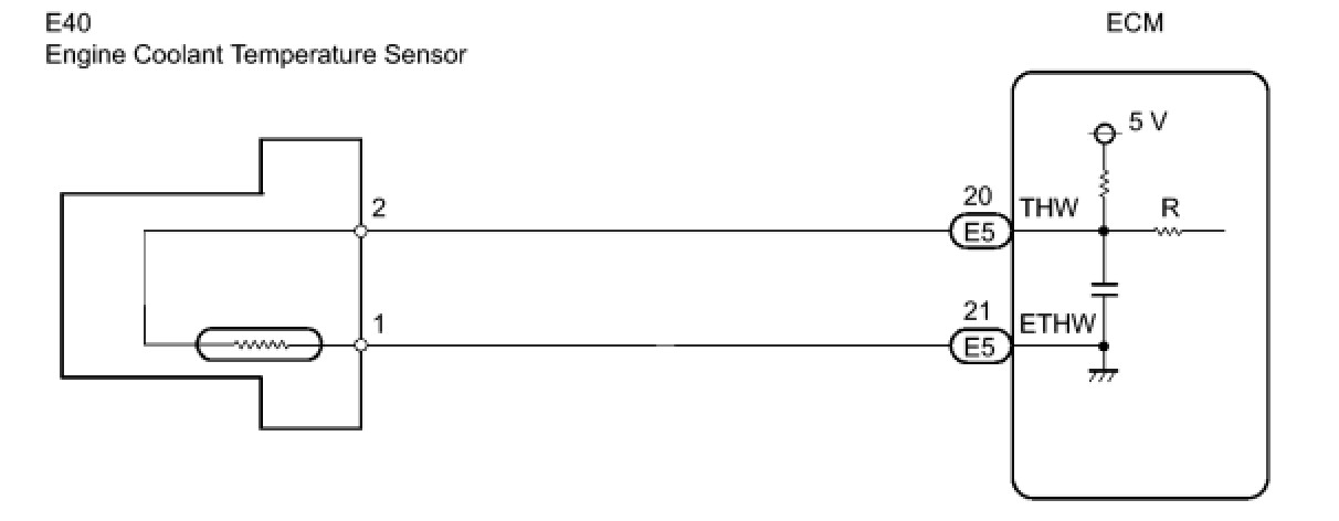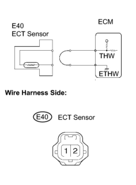 A thermistor is built into the Engine Coolant Temperature (ECT) sensor, of which the resistance value varies according to the ECT.