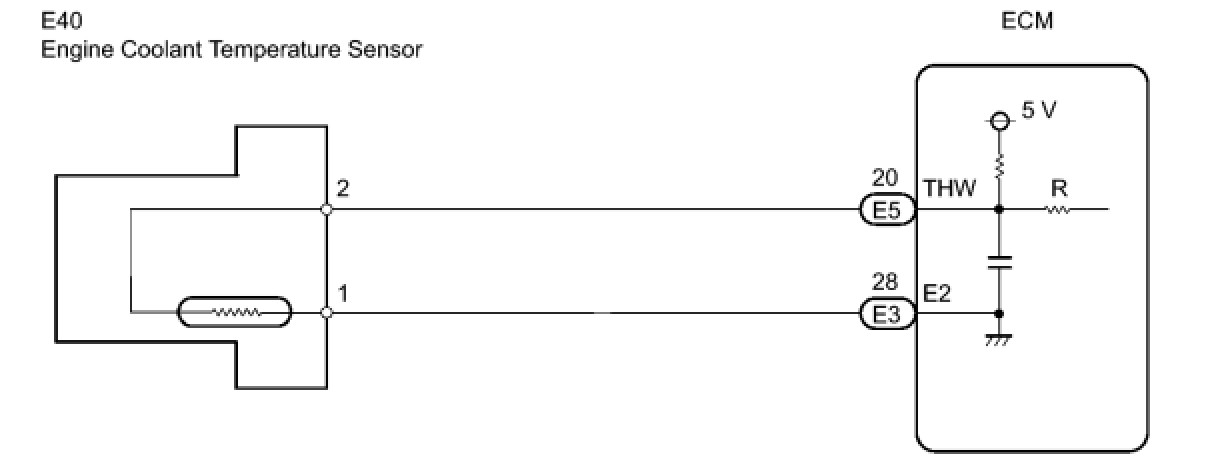 The resistance of the ECT varies in proportion to the actual ECT. The ECT supplies a constant voltage to the sensor and monitors the signal output voltage of the sensor. The signal voltage output varies according to the changing resistance of the sensor. After the engine is started, the ECT is monitored through this signal. If the ECT sensor indicates that the engine is not yet warm enough for closed-loop fuel control, despite a specified period of time having elapsed since the engine was started, the ECM interprets this as a malfunction in the sensor or cooling system and sets the DTC.