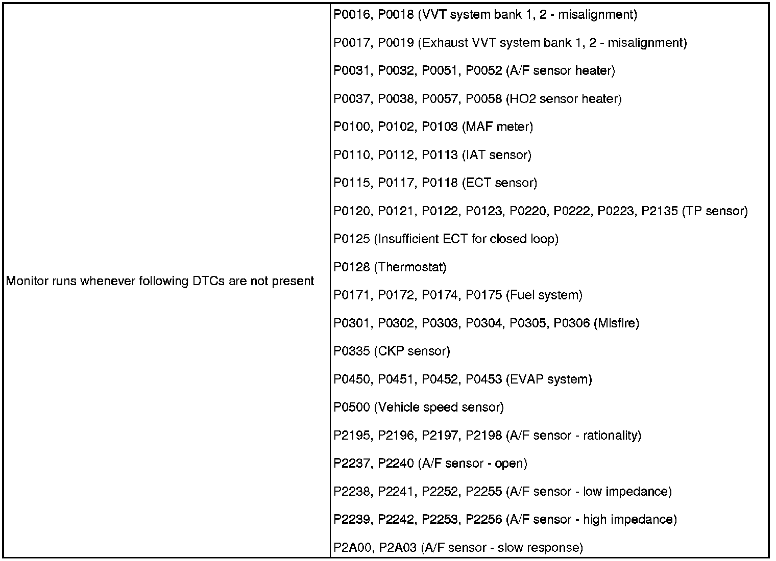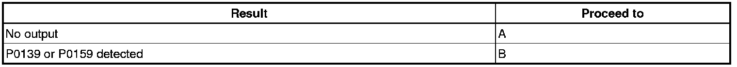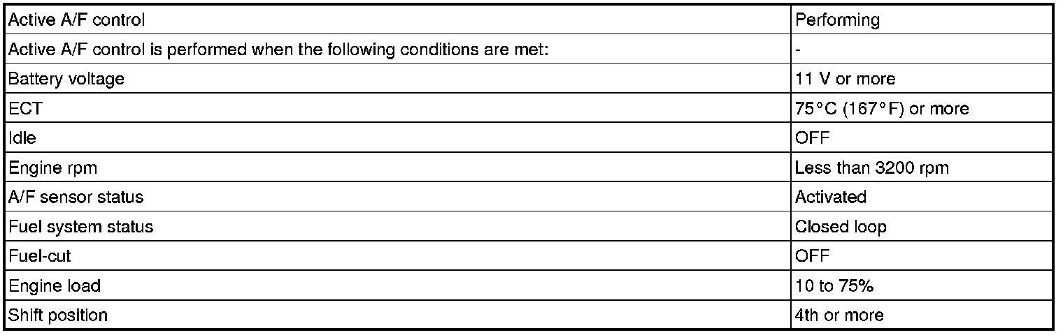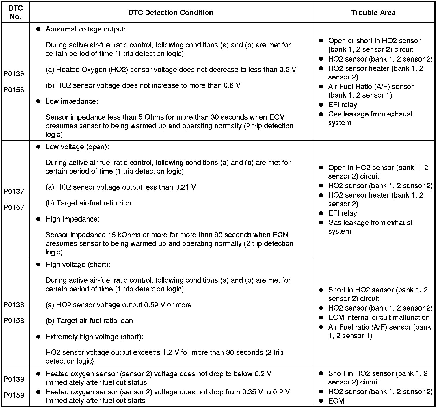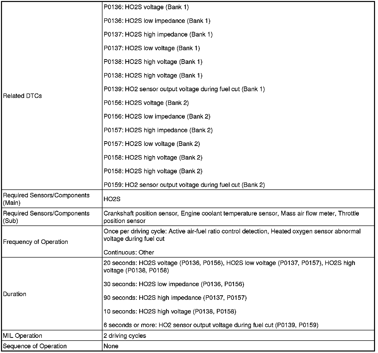 Active air-fuel ratio control is performed for approximately 15 to 20 seconds while driving with a warm engine. During active air-fuel ratio control, the air-fuel ratio is forcibly regulated to become lean or rich by the ECM. If the ECM detects a malfunction, one of the following DTCs is set: DTC P0136 or P0156 (abnormal voltage output), P0137 or P0157 (open circuit) or P0138 or P0158 (short circuit).