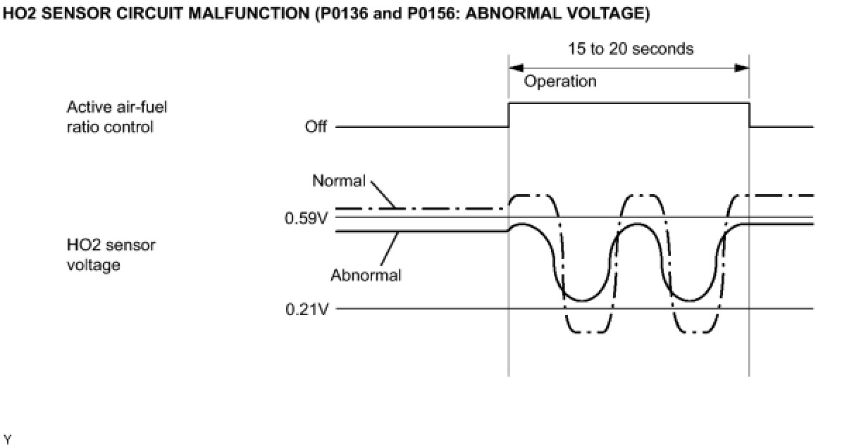While the ECM is performing active air-fuel ratio control, the air-fuel ratio is forcibly regulated to become rich or lean. If the sensor is not functioning properly, the voltage output variation is small. For example, when the HO2 sensor voltage does not decrease to less than 0.21 V and does not increase to more than 0.59 V during active air-fuel ratio control, the ECM determines that the sensor voltage output is abnormal and sets DTCs P0136 and P0156.