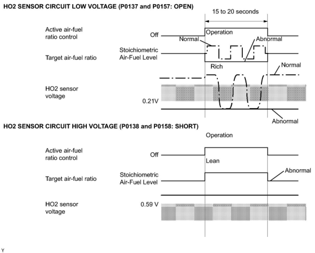 While performing active air-fuel ratio control, when the target air-fuel ratio is rich and the HO2 sensor voltage output is 0.21 V or less (lean), the ECM interprets this as an abnormally low sensor output voltage and sets DTC P0137 or P0157. When the target air-fuel ratio is lean and the voltage output is 0.59 V or more (rich) during active air-fuel ratio control, the ECM determines that the sensor voltage output is abnormally high, and sets DTC P0138 or P0158.