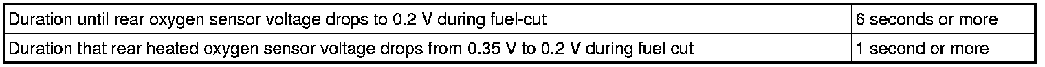 The sensor output voltage drops to below 0.2 V (extremely Lean status) immediately when the vehicle decelerates and fuel cut is operating. If the voltage does not drop to below 0.2 V for 6 seconds or more, or voltage does not drop from 0.35 V to 0.2 V for 1 second the ECM determines that the sensor's response feature has deteriorated, illuminates the MIL and sets a DTC.