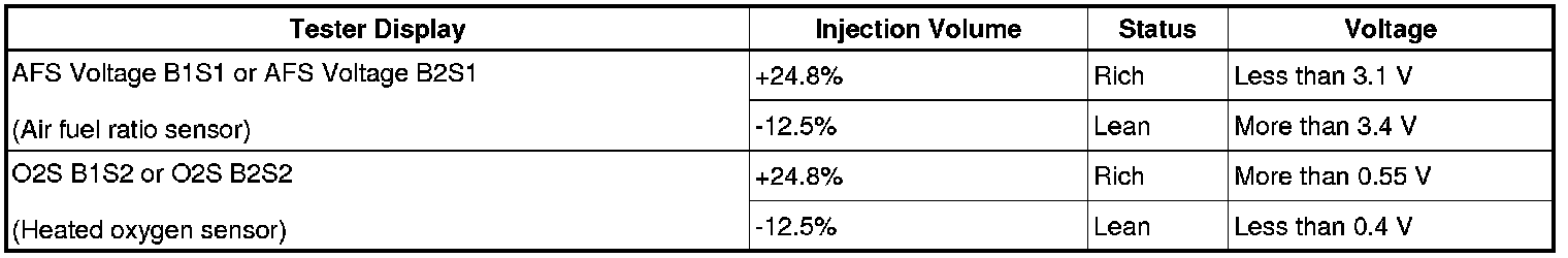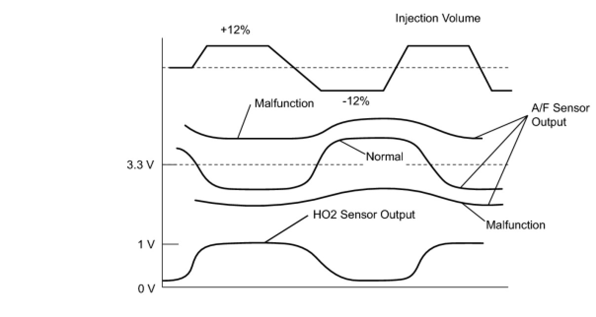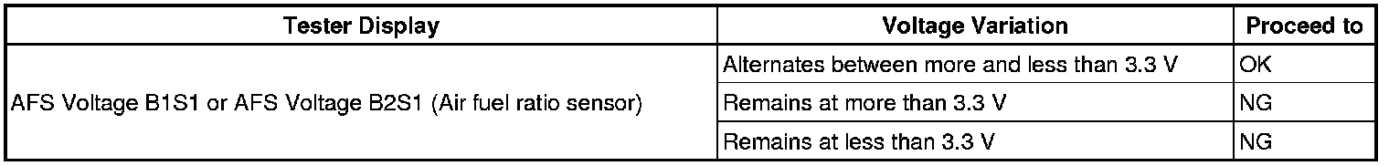 A normal heated oxygen sensor voltage (O2S B1S2 or O2S B2S2) reacts in accordance with increases and decreases in fuel injection volumes. When the air fuel ratio sensor voltage remains at either less or more than 3.3 V despite the heated oxygen sensor indicating a normal reaction, the air fuel ratio sensor is malfunctioning.