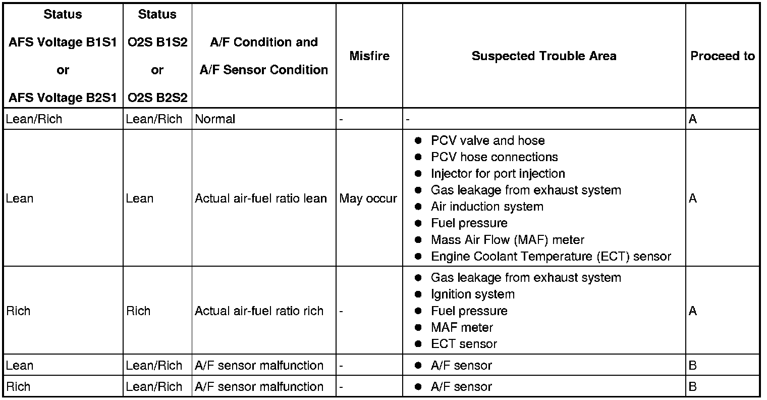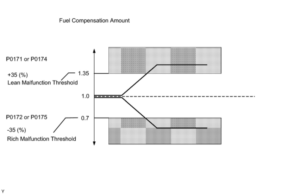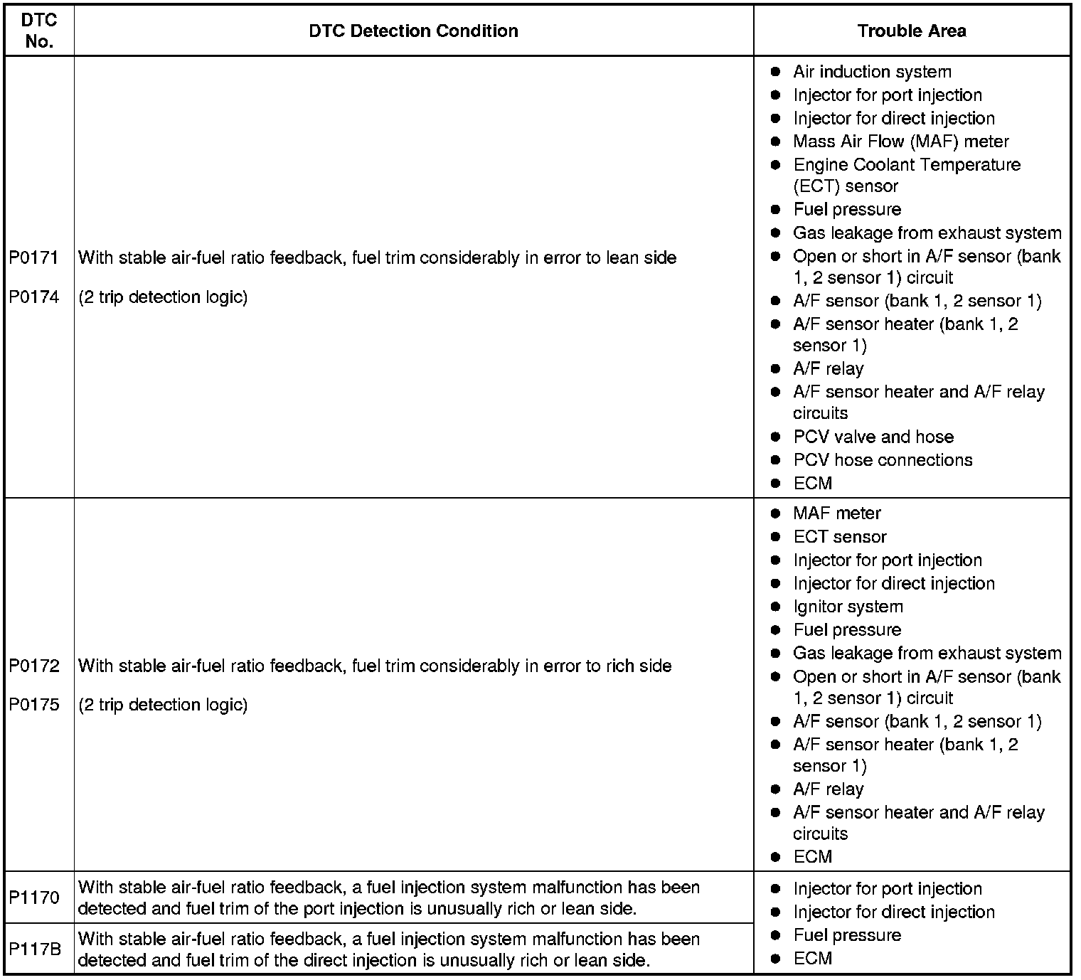 - When DTC P0171 or P0174 is set, the actual air-fuel ratio is on the lean side. When DTC P0172 or P0175 is set, the actual air-fuel ratio is on the rich side.