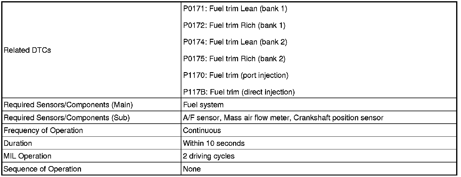 Under closed-loop fuel control, fuel injection volumes that deviate from those estimated by the ECM cause changes in the long-term fuel trim compensation value. The long-term fuel trim is adjusted when there are persistent deviations in the short-term fuel trim values. Deviations from the ECM's estimated fuel injection volumes also affect the average fuel trim learning value, which is a combination of the average short-term fuel trim (fuel feedback compensation value) and the average long-term fuel trim (learning value of the air-fuel ratio). If the average fuel trim learning value exceeds the malfunction threshold, the ECM interprets this as a fault in the fuel system and sets a DTC.