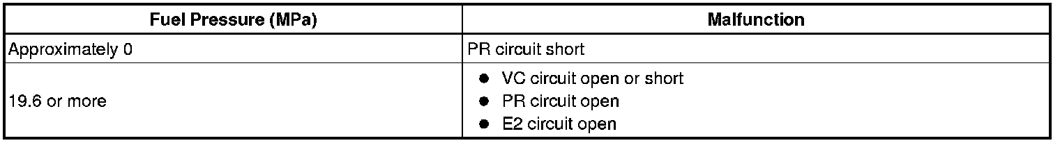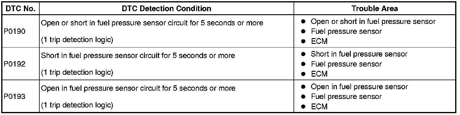 These DTCs are set if the fuel pressure sensor output voltage is out of the standard range. The DTCs stand for an open or short malfunction of the sensor circuit.