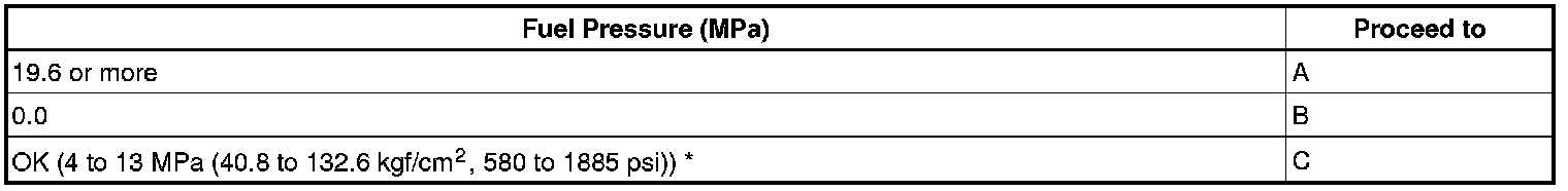 The fuel pressure in the delivery pipe is 4 to 13 MPa (40.8 to 132.6 kgf/cm2, 580 to 1885 psi).